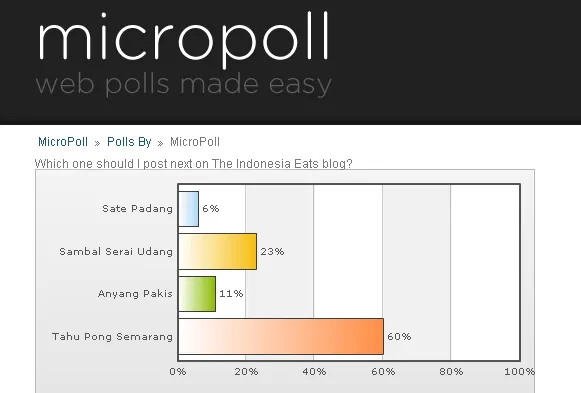 Let’s move on to what I’m going to post. Since I have been taking some different food pictures, I was confused which one that I’m going to post first. I finally did an online polls and the result was Tahu Pong Semarang as you can see the pic below.